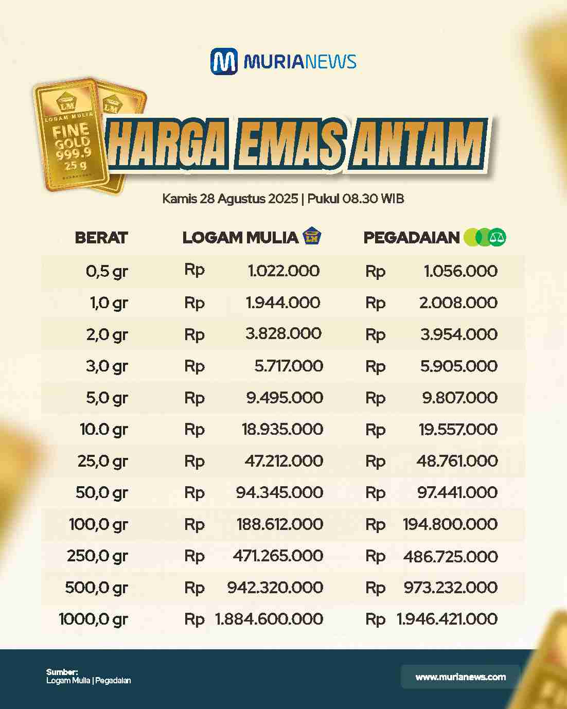 Murianews, Jakarta – Harga emas batangan PT Aneka Tambang Tbk (Antam) yang dipantau melalui laman resmi Logam Mulia, Kamis (28/8/2025), kembali mengalami penguatan.