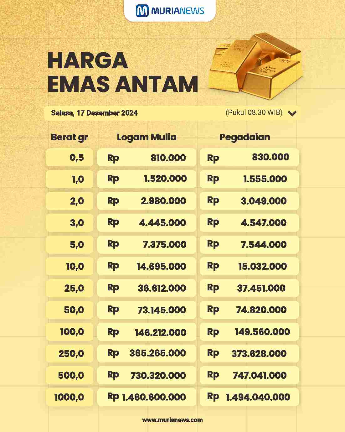 Murianews, KudusHarga emas batangan cetakan PT Aneka Tambang Tbk atau Emas Antam hari ini, Selasa (17/12/2024) menujukkan pergerakan berbeda.