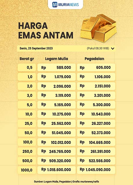 Murianews, Kudus – Harga emas Anatam pada perdagangan Senin (25/9/2023) masih cukup stabil. Harga emas keluaran Logam Mulia dan di Gerai 24 Pegadaian masih cukup menarik untuk investasi.