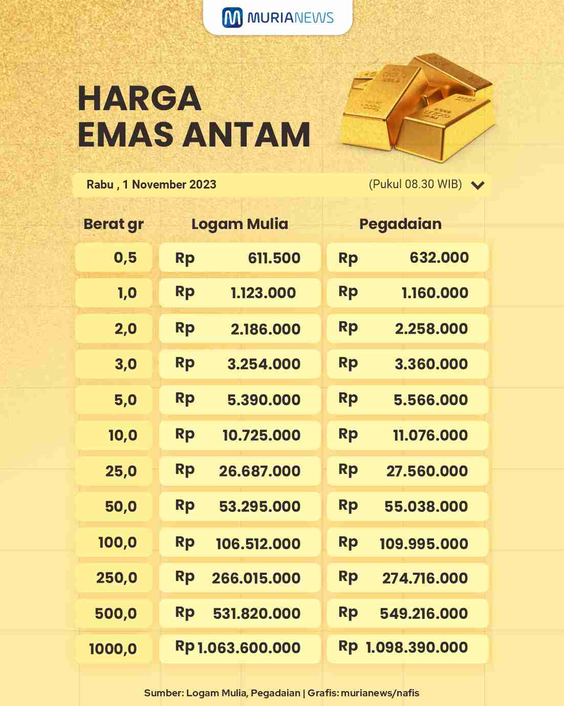 Berikut harga emas Antam di Logam Mulia dan Pegadaian Rabu 01 November 2023: