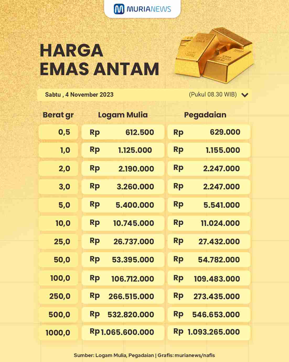 Berikut harga emas Antam di Logam Mulia dan Pegadaian Sabtu 04 November 2023: