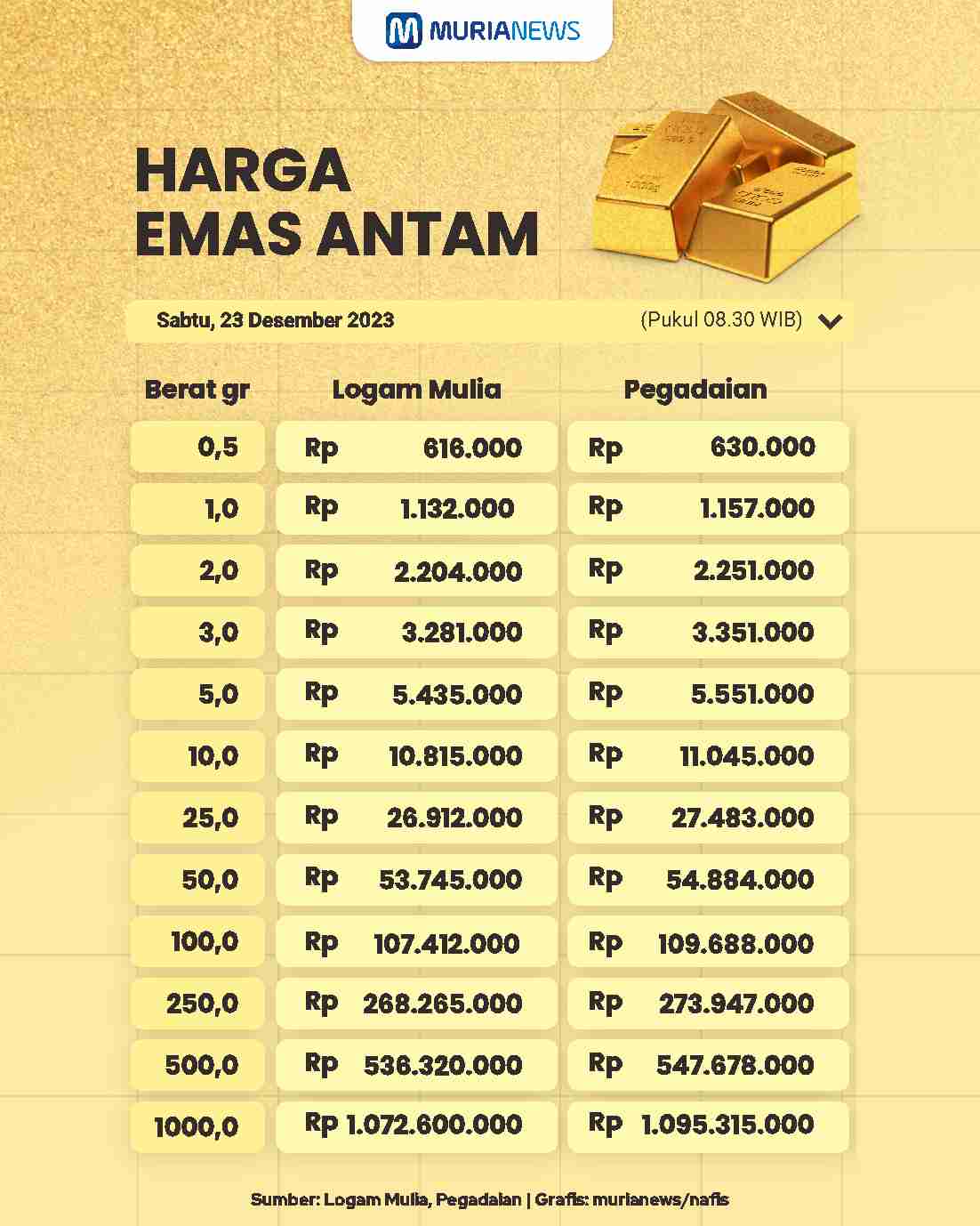 Berikut Rincaian Harga Emas Antam 23 Desember 2023: