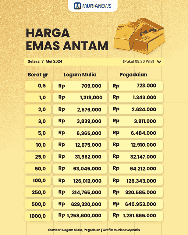 Sementara itu, harga emas Antam di Pegadaian kembali mengalami penurunan hari ini, Selasa (7/5/2024).