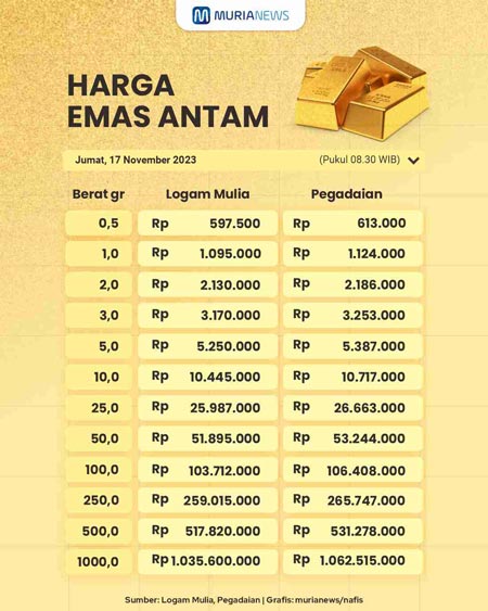 Berikut ini daftar lengkap harga emas di PT Pegadaian dan Logam mulia 17 November 2023: