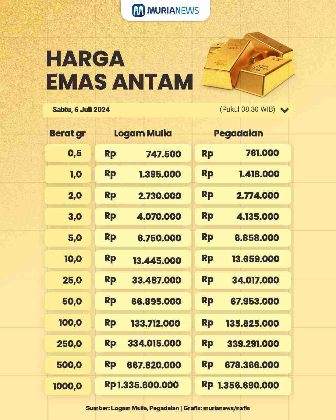 Berikut daftar harga emas di PT pegadaian dan laman logam mulia pada Sabtu, 6 Juli 2024: