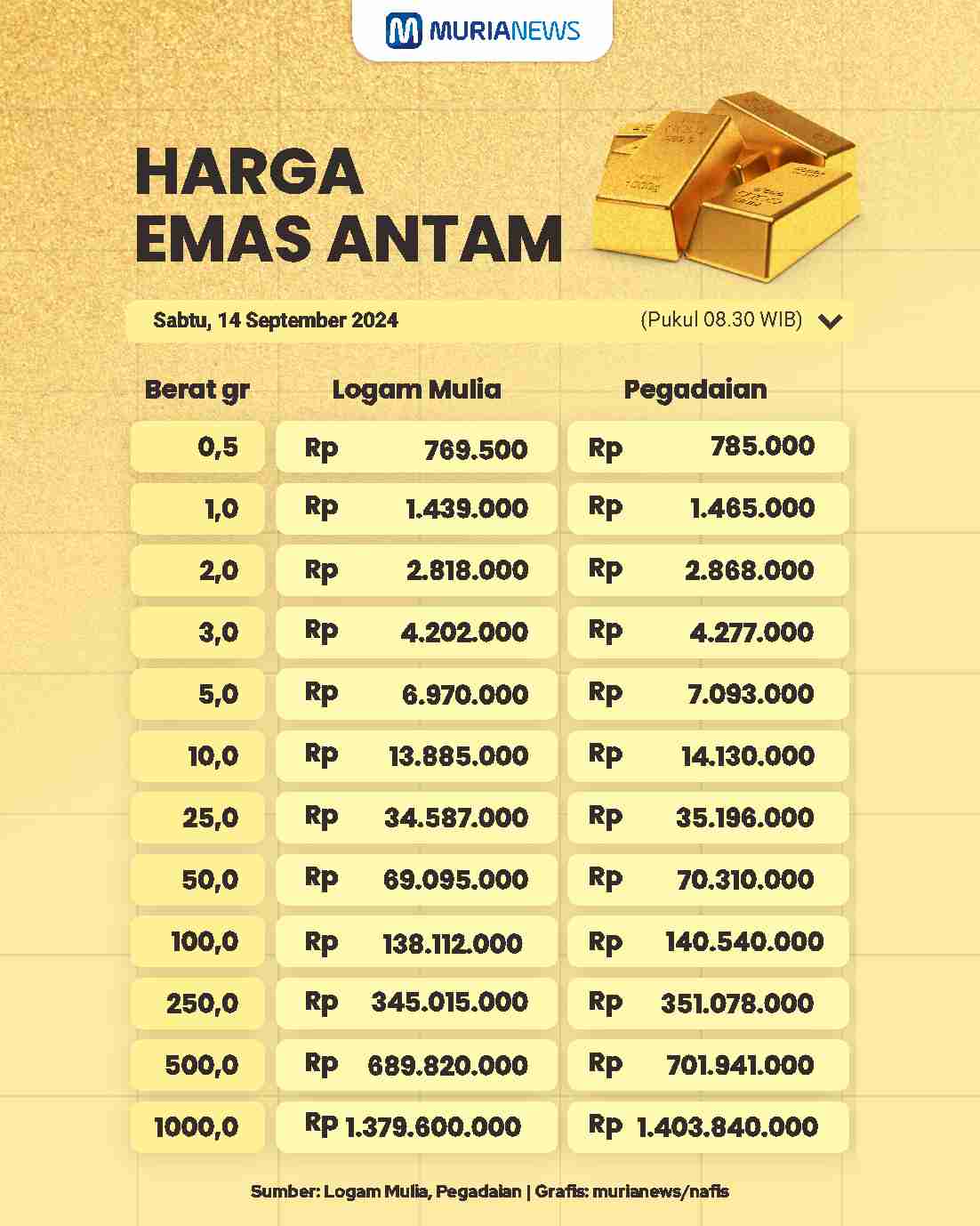 Berikut ini daftar harga emas di Pegadaian dan laman Logam Mulia pada Sabtu, 14 September 2024: