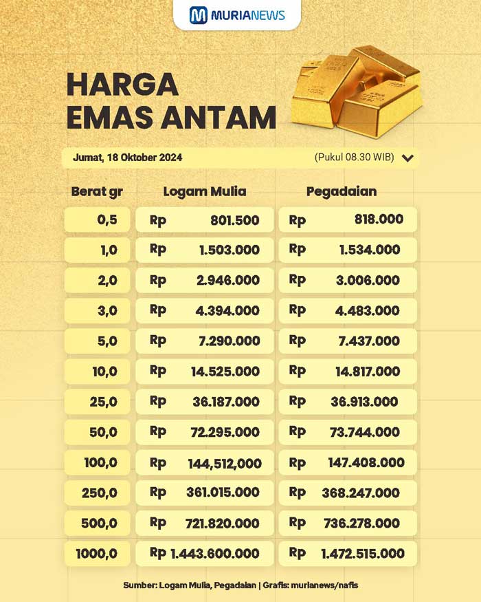 Murianews, Jakarta – Harga emas batangan 24 karat dari Antam pada Jumat (18/10/2024) dibanderol sebesar Rp1.503.000 per gram.