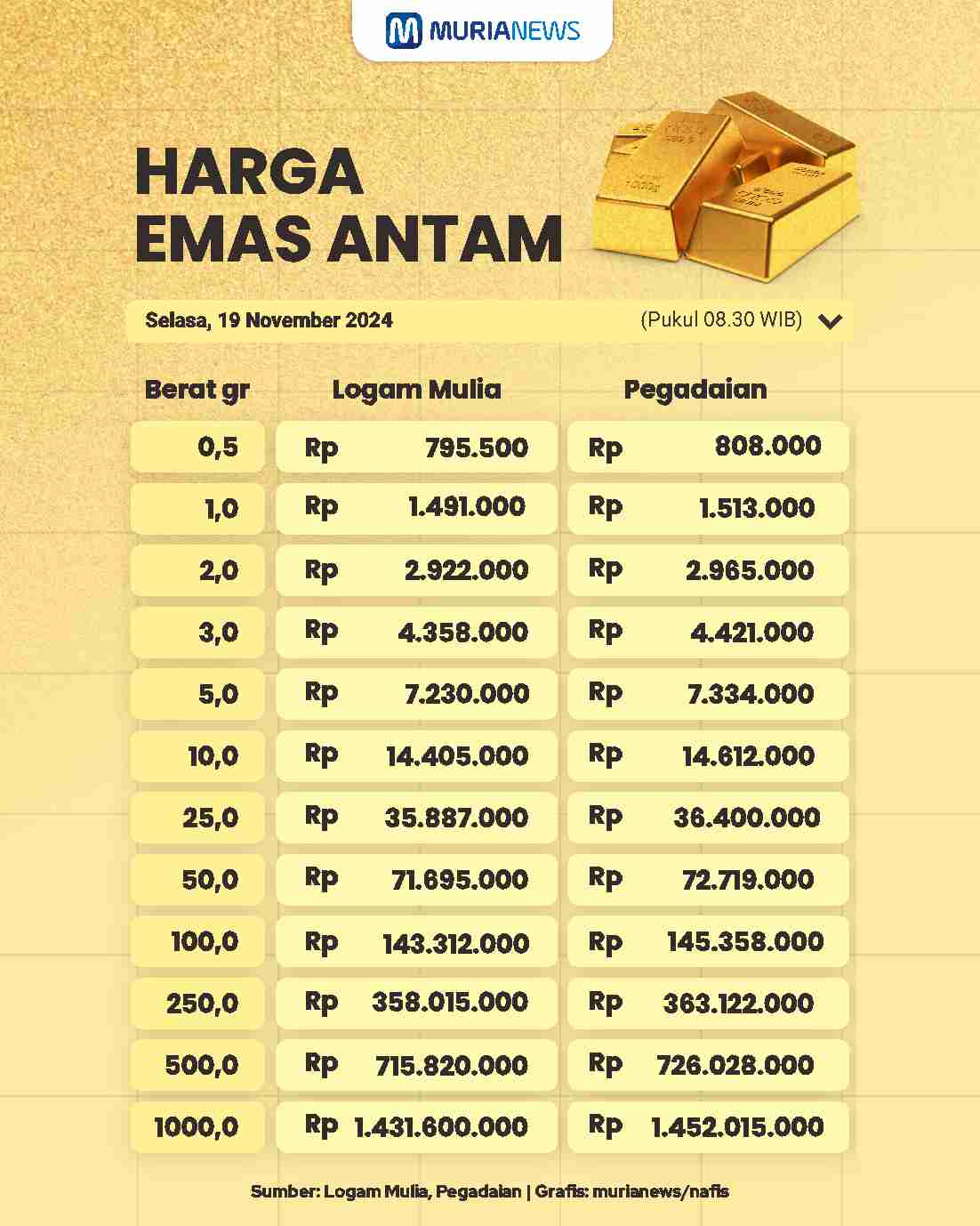 Berikut ini tabel harga emas di PT Pegadaian dan laman Logam Mulia per 19 November 2024: