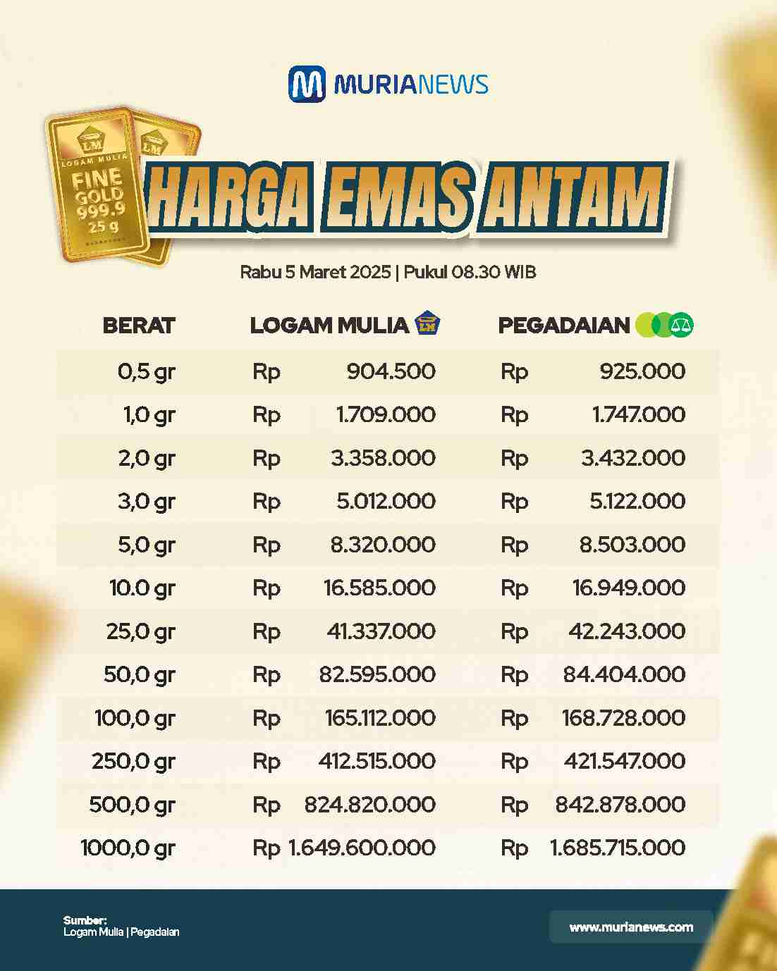 Berikut tabel lengkap harga emas Rabu 5 Maret 2025: