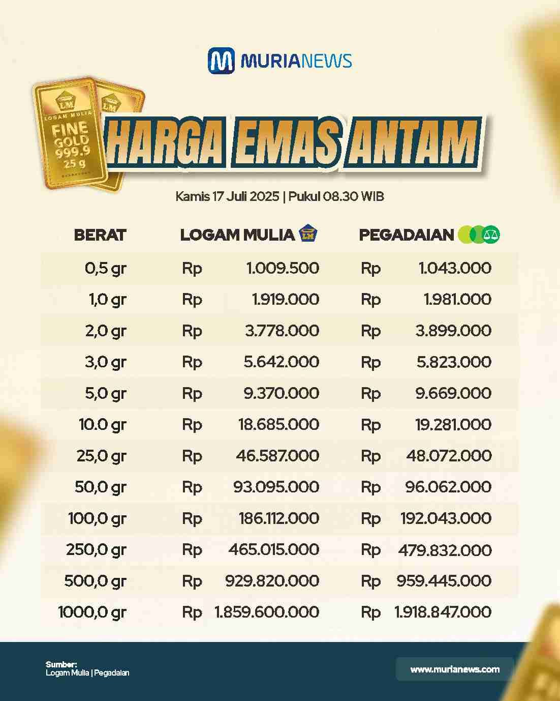 Berikut adalah harga pecahan emas batangan yang tercatat di laman Logam Mulia Antam pada Kamis (17/7/2025):