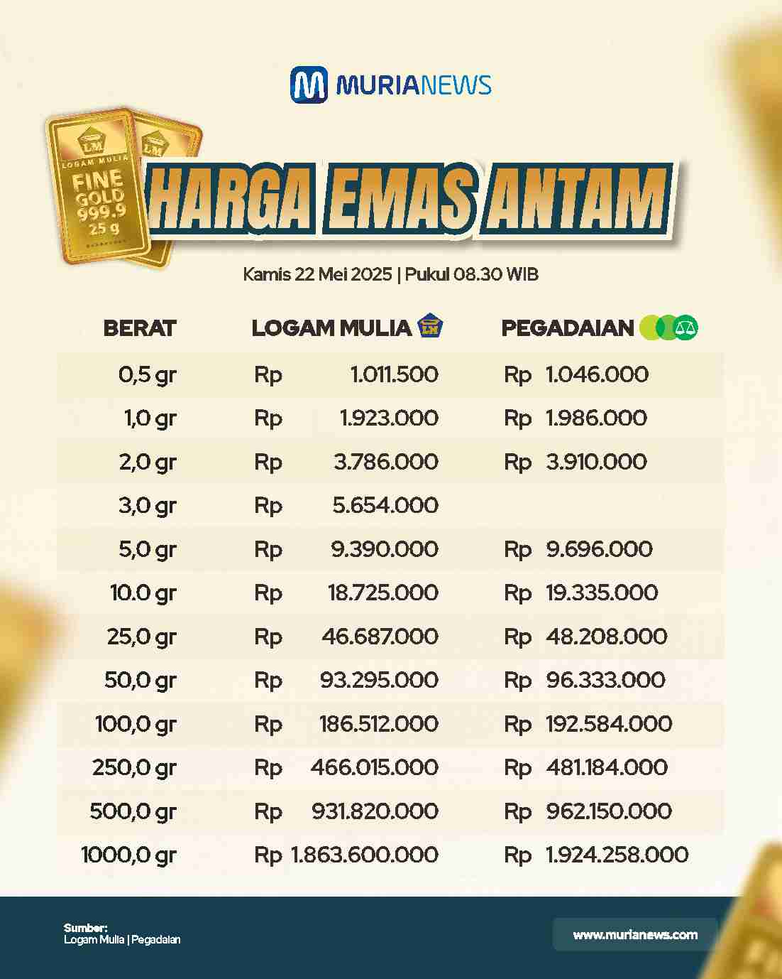 Baik Logam Mulia ataupun Pegadaian sama-sama menjual Antam mulai dari ukuran berat 0,5 gram hingga 1.000 gram. Berikut daftar harganya pada Kamis (22/5/2025):