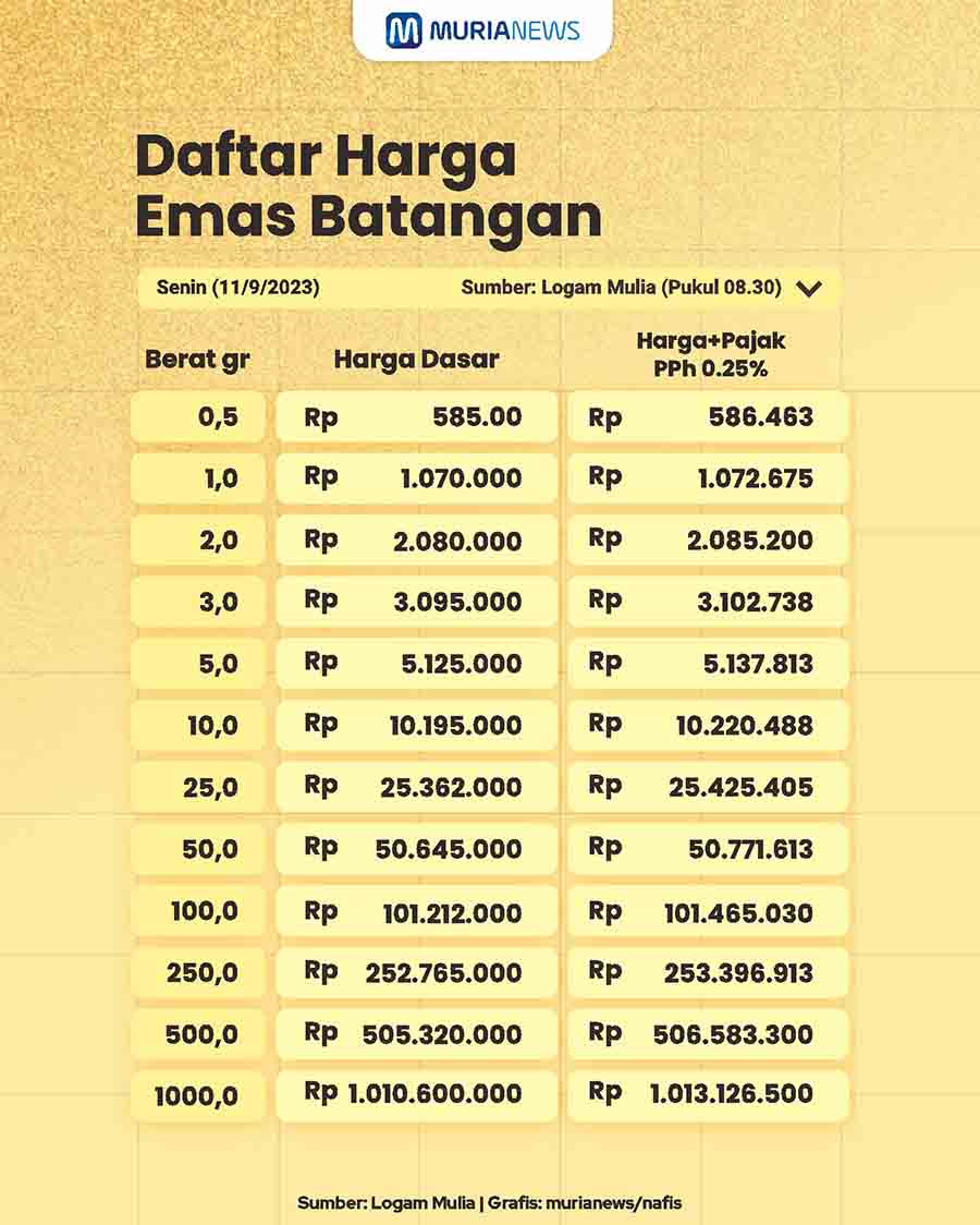 Meski LM mengakui ada kenaikan, Pegadaian justru tidak ada perubahan. Melansir situs resmi Pegadaian, harga logam mulia Antam ukuran terkecil 0,5 gram dijual Rp 600.000. Harga ini tidak berubah dibandingkan kemarin (10/9/2023).