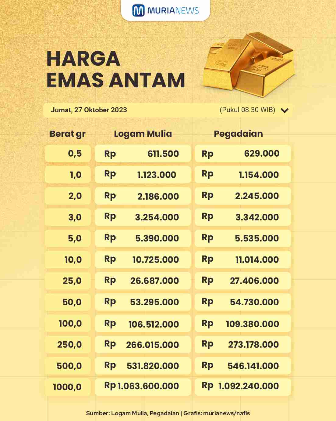 Murianews, Kudus – Harga emas Antam Jumat (27/10/2023) hari ini dilaporkan menurun di Logam Mulia. Hanya saja, penurunan tersebut tidak berlaku di Pegadaian. Melalui Galeri 24, emas Antam di Pegadaian justru naik meski hanya sedikit