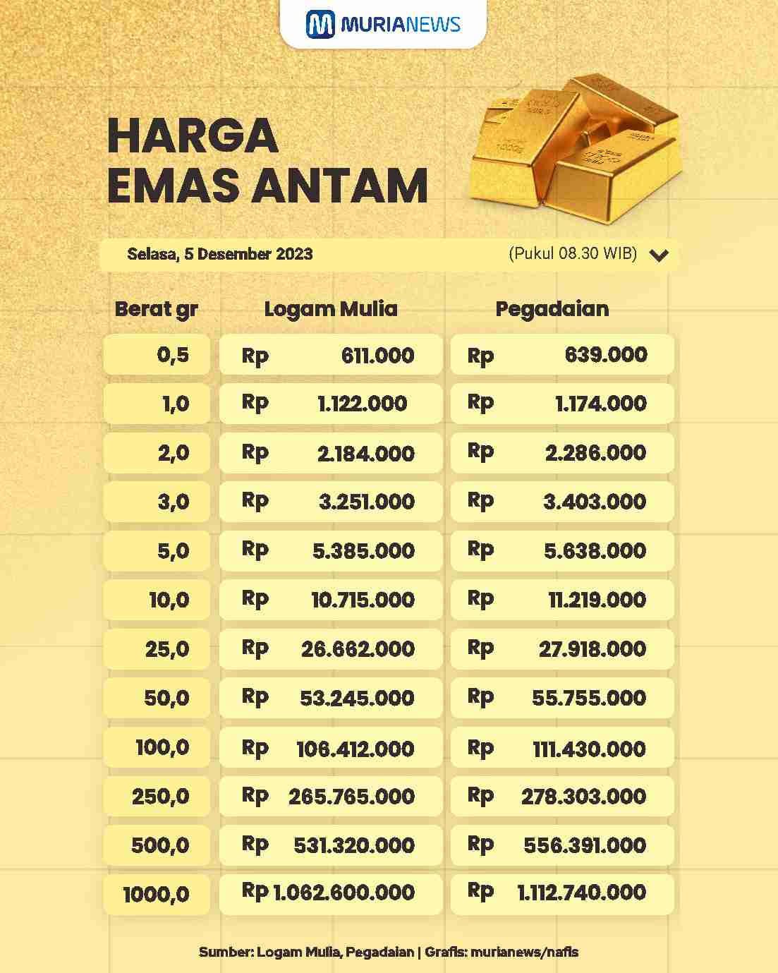 Adapun harga emas Antam hari ini ukuran 0,5 gram dijual seharga Rp 639.000 atau naik Rp 8.000. Kemudian, harga emas Antam ukuran 2 gram dijual Rp 2.286.000 atau naik Rp 31.000.