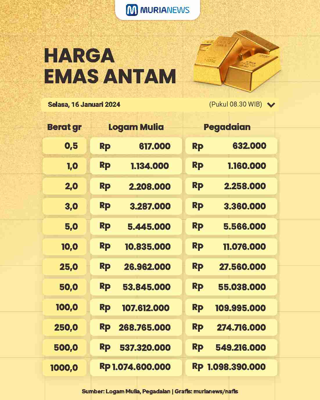 Melansir dari laman Logam Mulia, Selasa pagi harga emas Antam naik Rp 4.000 gram. Awal pekan kemarin (15/1/2024) harga emas Antam hanya berada di angka Rp 1.130.000 per gram. Saat ini harga emas Antam naik menjadi Rp 1.134.000 per gram. Harga ini merupakan harga fluktuatif dan berlaku untuk kelipatannya.