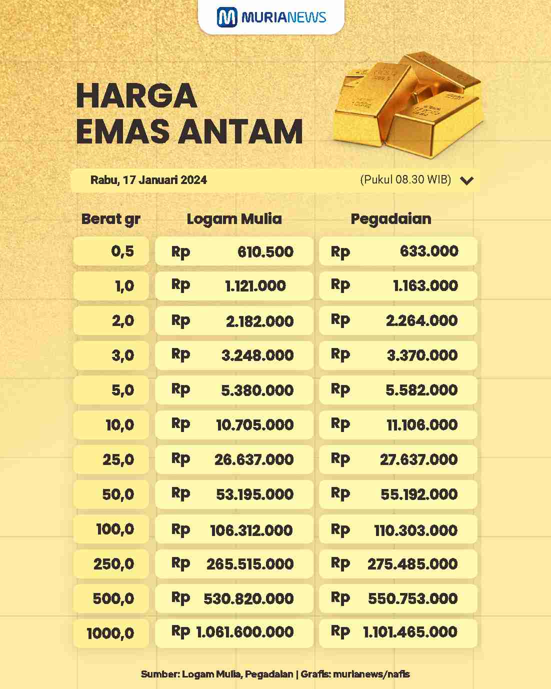 Murianews, Kudus – Harga emas Antam Rabu (17/1/2023) hari ini menunjukkan fluktuatif harga. Pasalnya, harga Antam bersertifikat Logam Mulia anjlok hingga Rp 13.000 per gram. Sementara harga Antam di Pegadaian mengalami kenaikan.