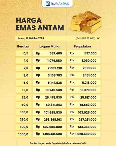 Untuk lebih lengkapnya Berikut ini harga emas di Logam Mulia dan Pegadaian, Kamis (12/10/2023);