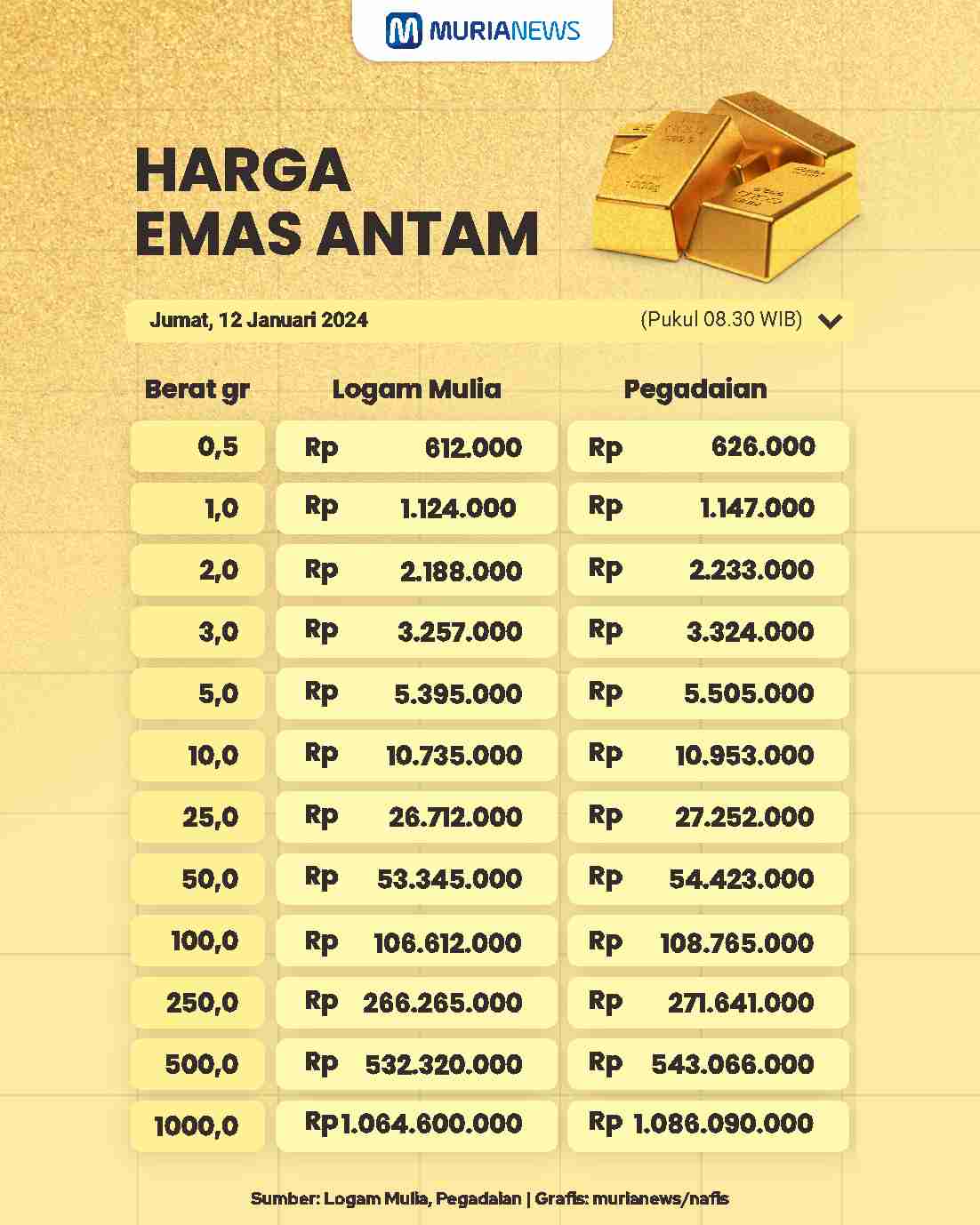 Dalam laman resmi PT Pegadaian, harga emas antam 1 gram hari ini (12/1/2024), berada di angka Rp 1.147.000. Harga ini turun sebesar Rp 3000 dari hari sebelumnya, Kamis (11/1/2024) yakni, Rp 1.150.000.