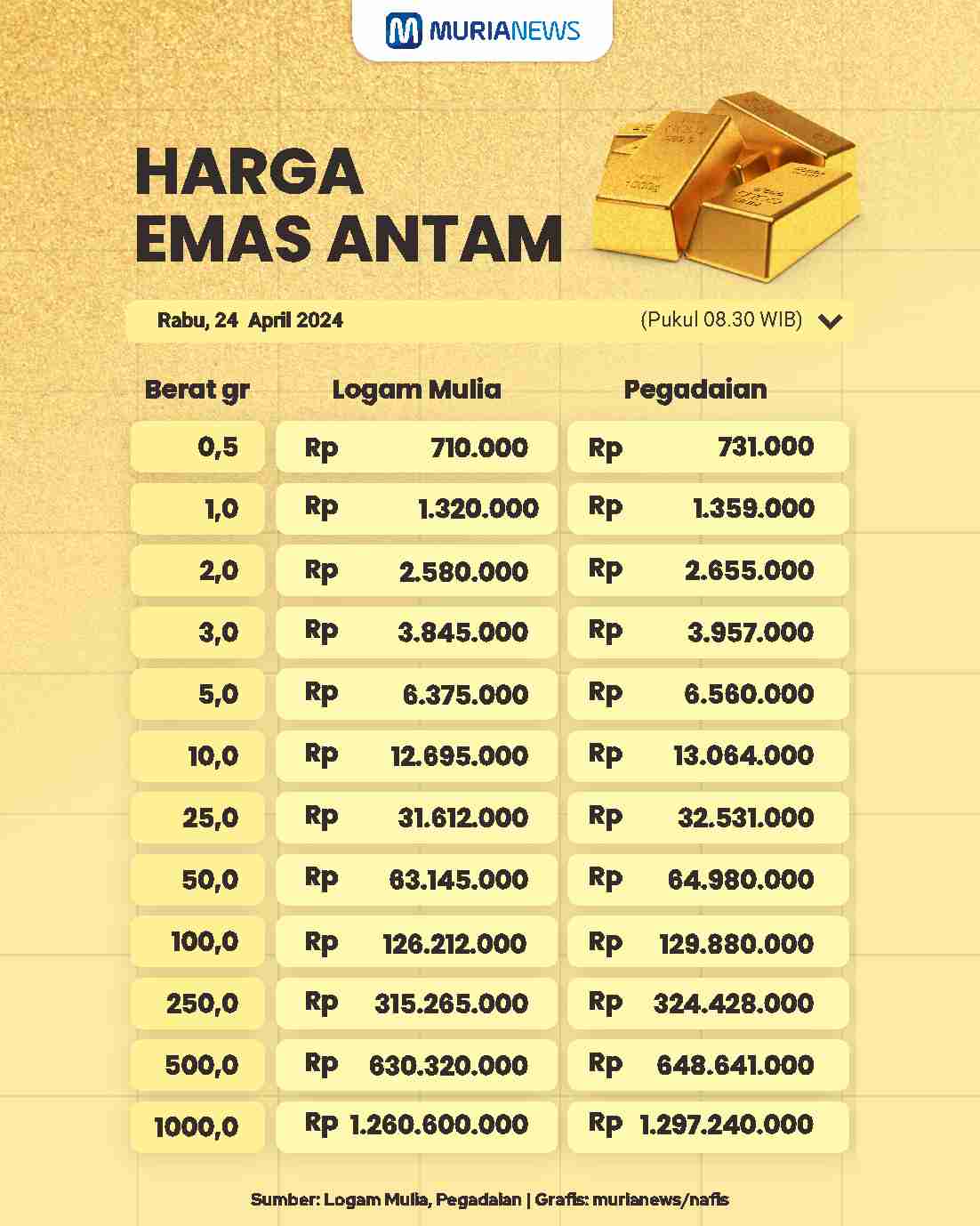 Berikut daftar lengkap harga emas antam Rabu (24/4/2024):