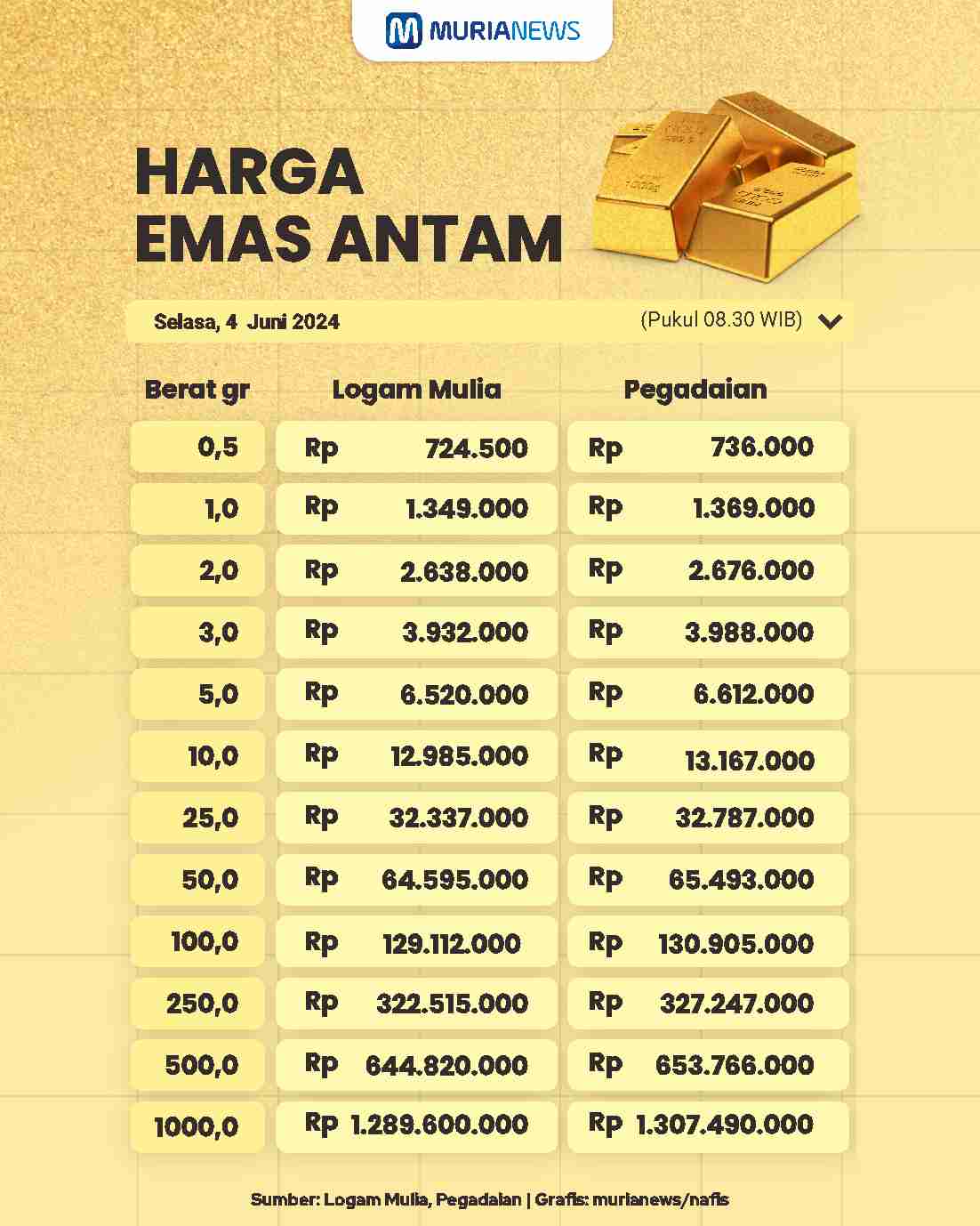 Berikut daftar harga emas antam di Logam Mulia dan Pegadaian, Selasa (4/6/2024):