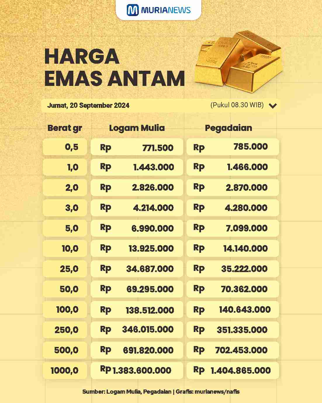 Berikut daftar harga emas antam di Logam Mulia dan Pegadaian, Jumat (20/9/2024):