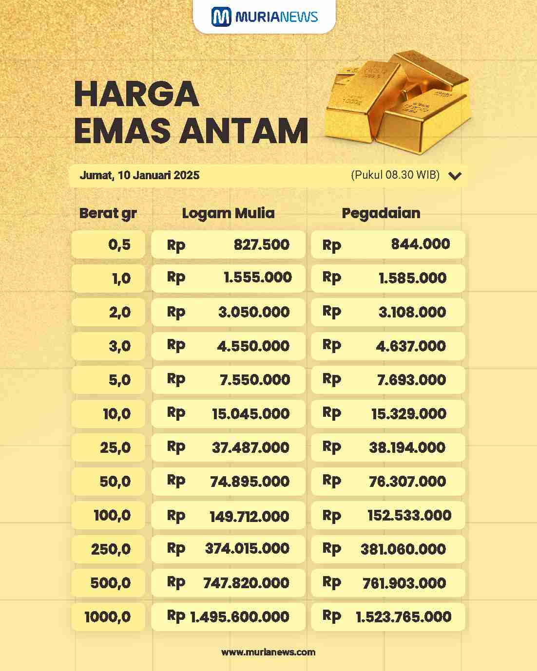 Sementara di PT Pegadaian, harga emas juga naik di angka Rp 1.585.000 per gram, Jumat (10/1/2025). Ada selisih Rp 5000 dari sebelumnya, Kamis (9/1/2025), yakni Rp 1.580.000 per gram.